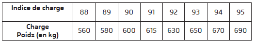 Indice de charge L'indice de charge indique la charge maximum autorisée sur un pneu individuel.